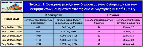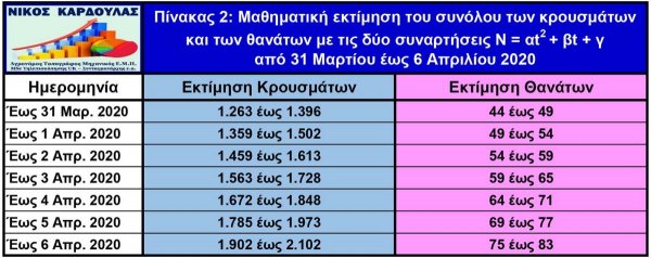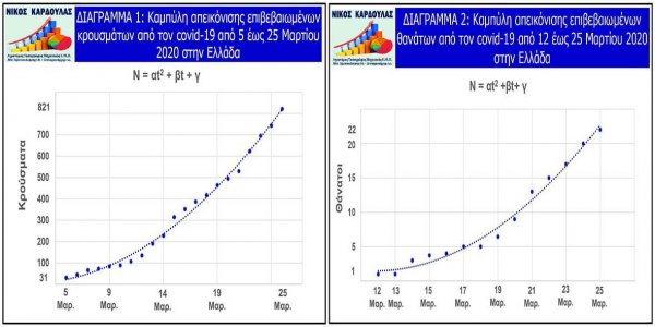 N = αt2 + βt + γ, όπου Ν είναι ο αριθμός των κρουσμάτων ή των θανάτων, t o χρόνος σε αριθμό ημερών και α, β και γ παράμετροι που υπολογίσθηκαν.