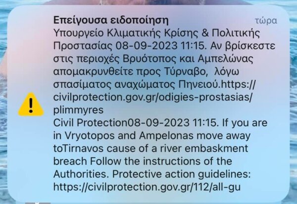 Μήνυμα της Πολιτικής Προστασίας στάλθηκε από το 112 στους κατοίκους Βρυοτόπου και Αμπελώνα για να εκκενώσουν άμεσα προς τον Τύρναβο, λόγω σπασίματος του αναχώματος.