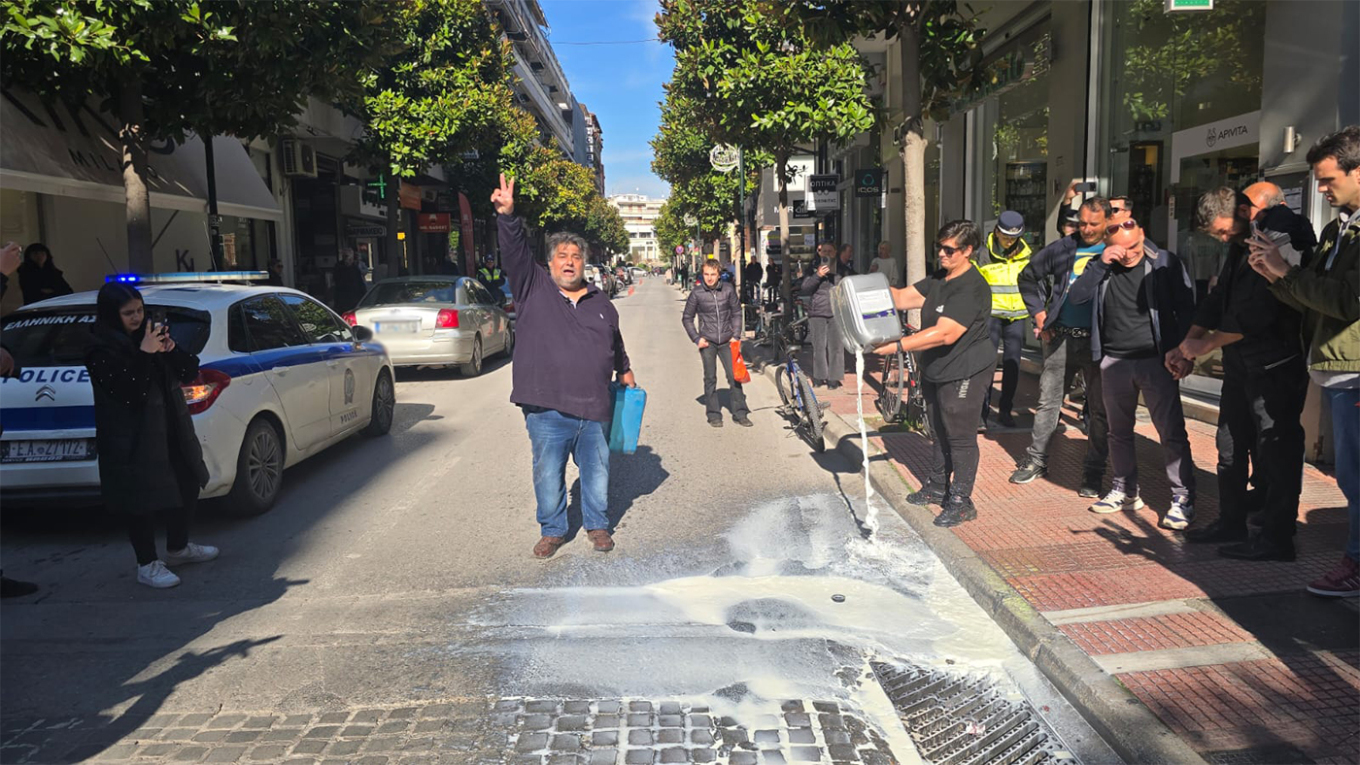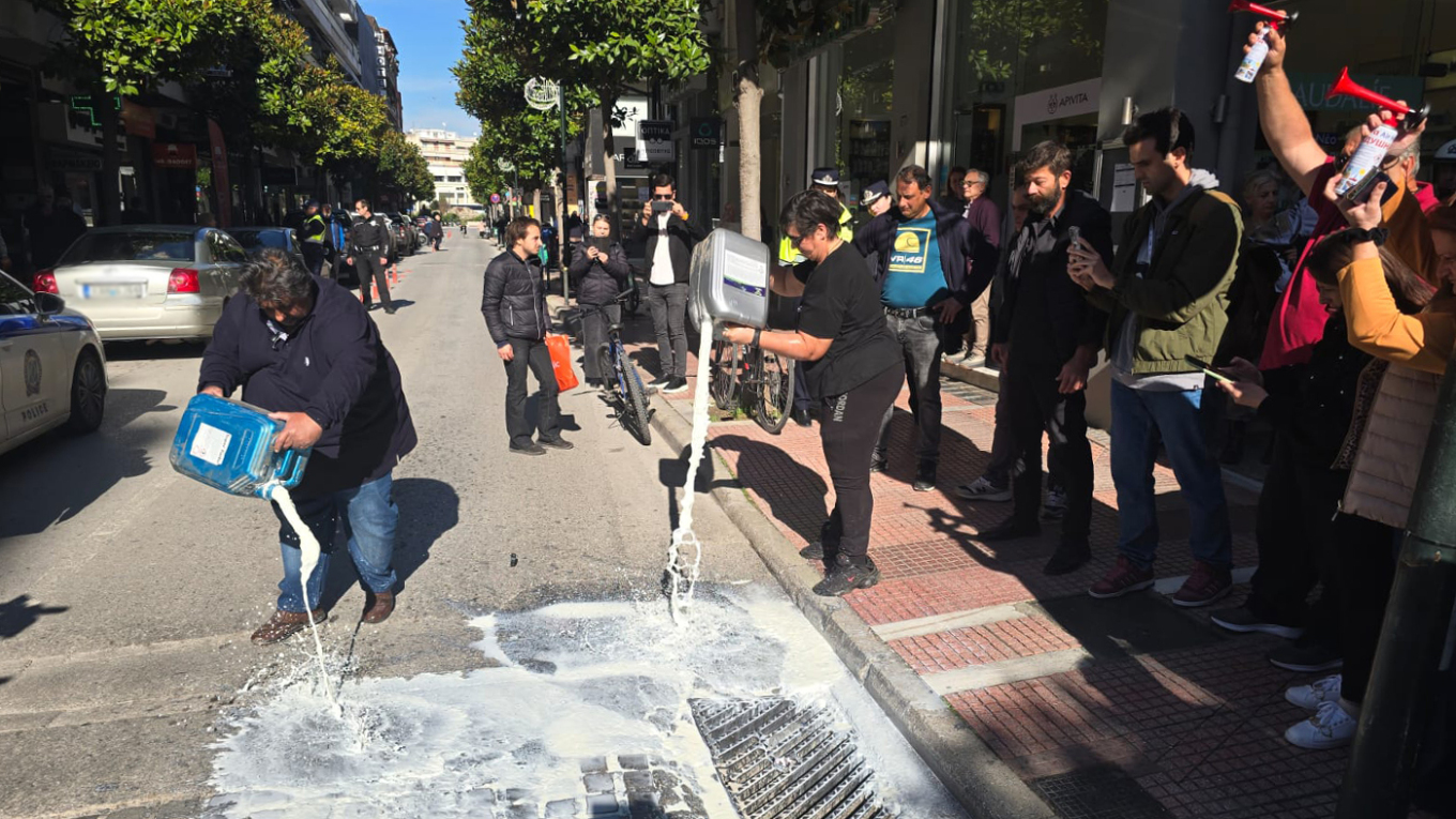 Οι συγκεντρωμένοι, θέλοντας να εκφράσουν την αγανάκτησή τους για την κυβερνητική πολιτική στον αγροτικό και κτηνοτροφικό τομέα, προχώρησαν σε συμβολική ενέργεια, ρίχνοντας γάλα στον δρόμο μπροστά από το γραφείο του υφυπουργού.