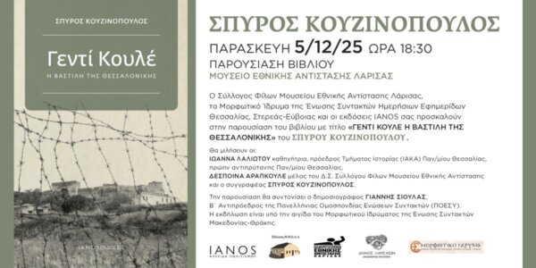 Το Μορφωτικό Ίδρυμα της Ένωσης Συντακτών Ημερήσιων Εφημερίδων Θεσσαλίας, Στερεάς – Εύβοιας, ο Σύλλογος Φίλων του Μουσείου Εθνικής Αντίστασης Λάρισας και οι εκδόσεις ΙΑΝΟΣ, παρουσιάζουν την Παρασκευή 5 Δεκεμβρίου, ώρα 18:30 στην αίθουσα εκδηλώσεων του Μουσείου Εθνικής Αντίστασης Λάρισας (οδός Ιουστινιανού 42), το βιβλίο του δημοσιογράφου και συγγραφέα Σπύρου Κουζινόπουλου με τίτλο «Γεντί Κουλέ η Βαστίλη της Θεσσαλονίκης».