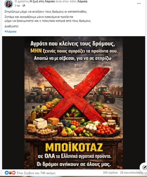 Χαρακτηριστική η ομάδα που έχει δημιουργηθεί στη Λάρισα στο Facebook με τίτλο “Η Ζωή στη Λάρισα” στην οποία θα δείτε μία άνευ προηγουμένου ενορχηστρωμένη επίθεση εναντίον σύσσωμου του αγροτικού κόσμου της χώρας και αναφέρει χαρακτηριστικά