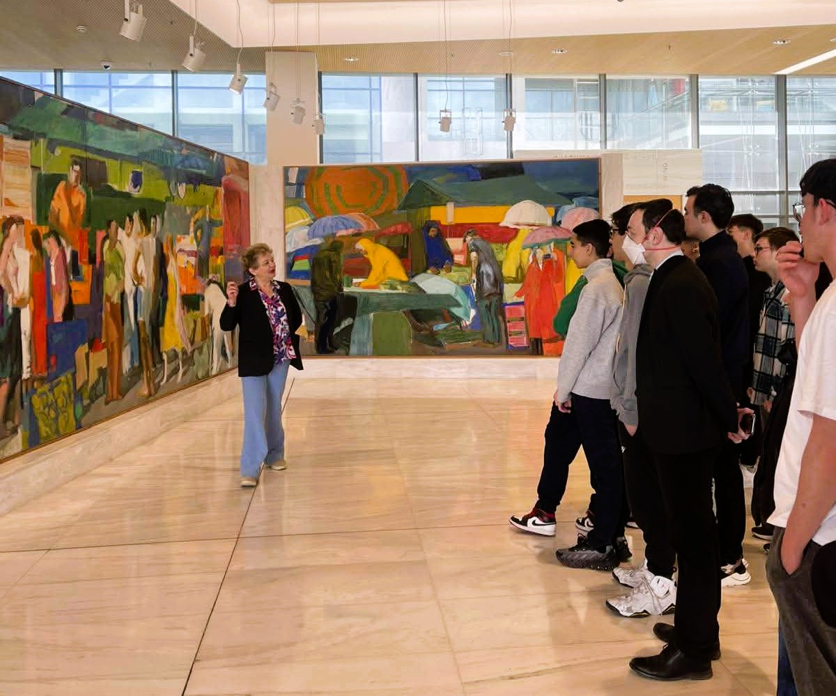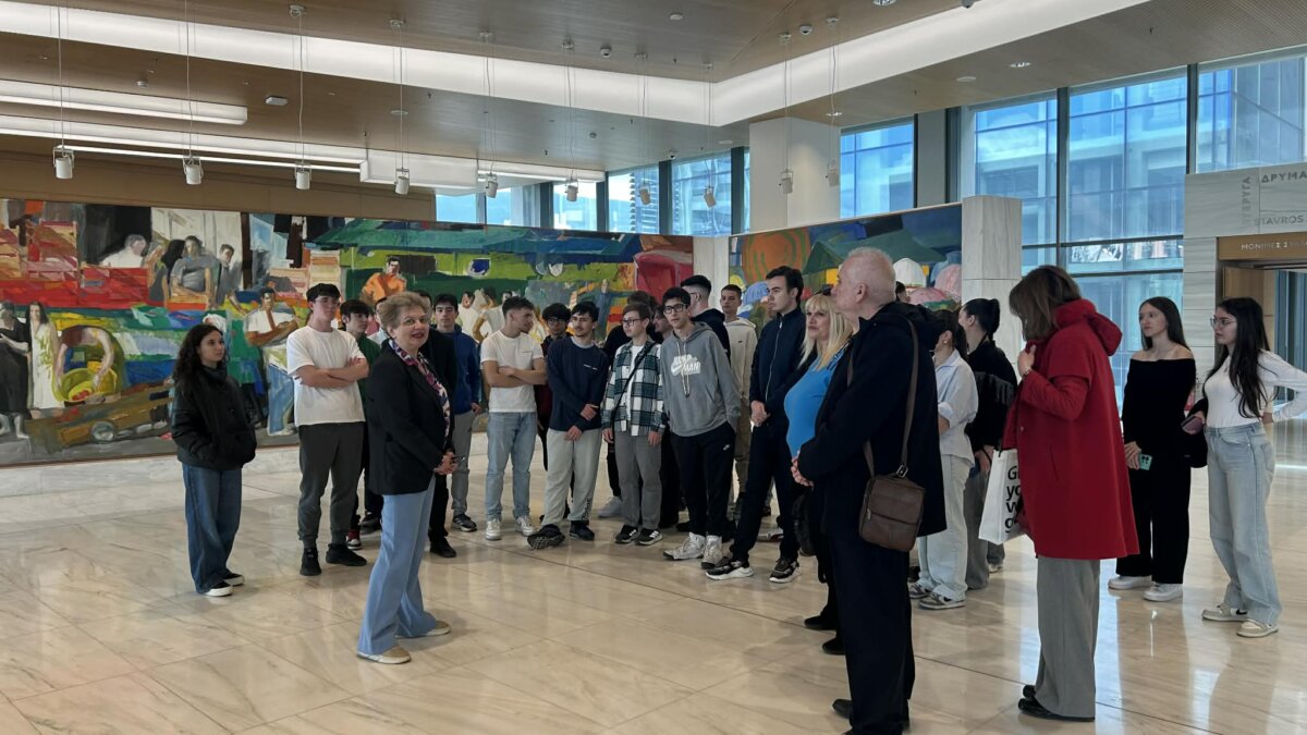 Κατά την επίσκεψή τους οι μαθητές και μαθήτριες του σχολείου είχαν τη σπάνια ευκαιρία, τη μεγάλη χαρά και την υψίστη τιμήνα ξεναγηθούν στη μόνιμη έκθεση από τη Λαρισαία Διευθύντρια της Εθνικής Πινακοθήκης, Ιστορικό Τέχνης, Δρ. Συραγώ Τσιάρα.Η περιήγηση ξεκίνησε με την ενημέρωση των μαθητών/-τριών από την κ. Τσιάρα για το σκεπτικό διαμόρφωσης του περιβάλλοντος χώρου, της εισόδου και του φουαγιέ του κτηρίου της Εθνικής Πινακοθήκης και την παρουσίαση του «Πύθωνα», γλυπτής εγκατάστασης του Κώστα Τσόκλη, και της μνημειακής πολυχρωμίας της «Λαϊκής Αγοράς» του Παναγιώτη Τέτση.